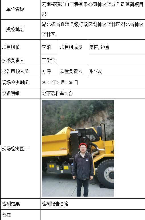 云南鄂联矿山工程有限公司神农架分公司莲简项目部2026/04/072026年检测检验项目 00 上一篇: 云南鄂联矿山工程有限公司神农架分公司寨湾项目部下一篇: 湖北欧冶矿业集团有限公司丁东磷矿 相关推荐 吉安市青原区茶家山采石场(普通合伙) 2026/04/09 3 查看全文 阳新县宏达矿业有限责任公司 2026/04/08 1 查看全文 湖北兴发化工集团股份有限公司兴-神磷矿瓦屋矿区IV矿段 2026/04/08 1 查看全文 湖北冯家山矿业有限责任公司 2026/04/08 1 查看全文 您好!请登录 点击取消回复 称呼: 邮箱: 点击这里取消回复。