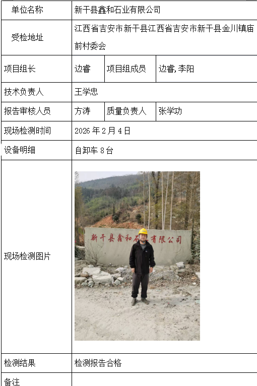 新干县鑫和石业有限公司2026/04/072026年检测检验项目 20 上一篇: 泰和县上圯乡白马田采石场下一篇: 大冶市金成矿业有限责任公司李万隆铁矿 相关推荐 宜昌兴臣爆破工程有限公司南沟磷矿项目部 2026/04/17 1 查看全文 湖北三鑫金铜股份有限公司 2026/04/17 0 查看全文 湖北信佳建设工程有限公司驻大杉树磷矿项目部 2026/04/17 0 查看全文 湖北三宁矿业有限公司挑水河磷矿东部矿段909工区 2026/04/17 1 查看全文 您好!请登录 点击取消回复 称呼: 邮箱: 点击这里取消回复。