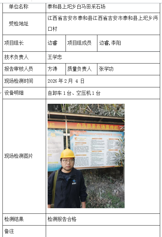 泰和县上圯乡白马田采石场2026/04/072026年检测检验项目 00 上一篇: 鄂州市鸿福实业有限责任公司下一篇: 新干县鑫和石业有限公司 相关推荐 吉安市青原区茶家山采石场(普通合伙) 2026/04/09 3 查看全文 阳新县宏达矿业有限责任公司 2026/04/08 1 查看全文 湖北兴发化工集团股份有限公司兴-神磷矿瓦屋矿区IV矿段 2026/04/08 1 查看全文 湖北冯家山矿业有限责任公司 2026/04/08 3 查看全文 您好!请登录 点击取消回复 称呼: 邮箱: 点击这里取消回复。