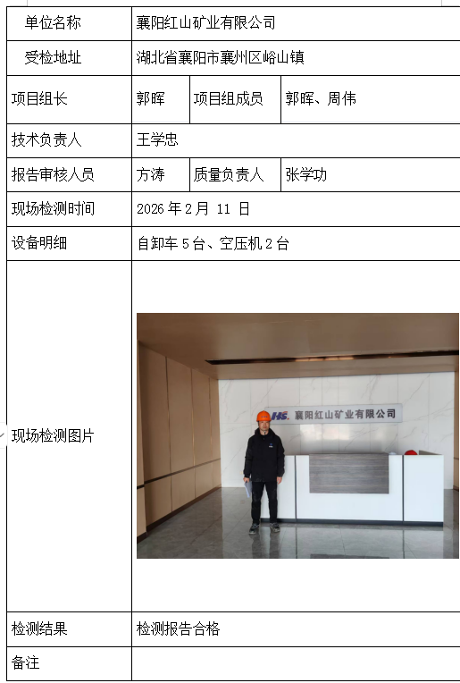 襄阳红山矿业有限公司2026/04/072026年检测检验项目 20 上一篇: 武钢资源集团大冶铁矿有限公司下一篇: 武钢资源集团大冶铁矿有限公司 相关推荐 吉安市青原区茶家山采石场(普通合伙) 2026/04/09 6 查看全文 阳新县宏达矿业有限责任公司 2026/04/08 4 查看全文 湖北兴发化工集团股份有限公司兴-神磷矿瓦屋矿区IV矿段 2026/04/08 4 查看全文 湖北冯家山矿业有限责任公司 2026/04/08 5 查看全文 您好!请登录 点击取消回复 称呼: 邮箱: 点击这里取消回复。