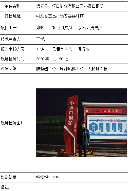 远安县小汉口矿业有限公司小汉口铜矿2026/04/072026年检测检验项目 00 上一篇: 大冶有色金属有限责任公司铜绿山铜铁矿下一篇: 中建材湖南非金属矿有限公司 相关推荐 吉安市青原区茶家山采石场(普通合伙) 2026/04/09 3 查看全文 阳新县宏达矿业有限责任公司 2026/04/08 1 查看全文 湖北兴发化工集团股份有限公司兴-神磷矿瓦屋矿区IV矿段 2026/04/08 1 查看全文 湖北冯家山矿业有限责任公司 2026/04/08 1 查看全文 您好!请登录 点击取消回复 称呼: 邮箱: 点击这里取消回复。