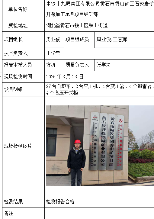 中铁十九局集团有限公司黄石市秀山矿区石灰岩矿开采加工承包项目经理部2026/04/082026年检测检验项目 20 上一篇: 吉安市青原区茶家山采石场(普通合伙)下一篇: 大冶市刘仁八镇矿业有限公司大段硅石矿 相关推荐 宜昌兴臣爆破工程有限公司南沟磷矿项目部 2026/04/17 0 查看全文 湖北三鑫金铜股份有限公司 2026/04/17 0 查看全文 湖北信佳建设工程有限公司驻大杉树磷矿项目部 2026/04/17 0 查看全文 湖北三宁矿业有限公司挑水河磷矿东部矿段909工区 2026/04/17 0 查看全文 您好!请登录 点击取消回复 称呼: 邮箱: 点击这里取消回复。