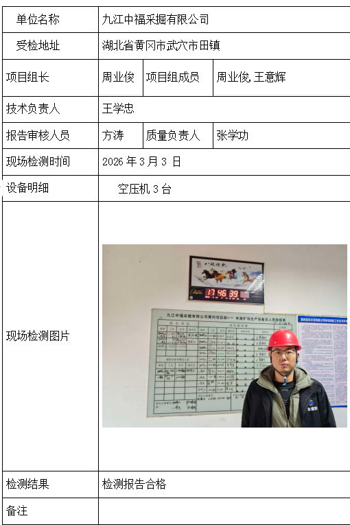 九江中福采掘有限公司2026/04/082026年检测检验项目 30 上一篇: 武穴市大法寺镇泉水洼石灰厂下一篇: 湖北宜化江家墩矿业有限公司 相关推荐 宜昌兴臣爆破工程有限公司南沟磷矿项目部 2026/04/17 1 查看全文 湖北三鑫金铜股份有限公司 2026/04/17 0 查看全文 湖北信佳建设工程有限公司驻大杉树磷矿项目部 2026/04/17 0 查看全文 湖北三宁矿业有限公司挑水河磷矿东部矿段909工区 2026/04/17 1 查看全文 您好!请登录 点击取消回复 称呼: 邮箱: 点击这里取消回复。