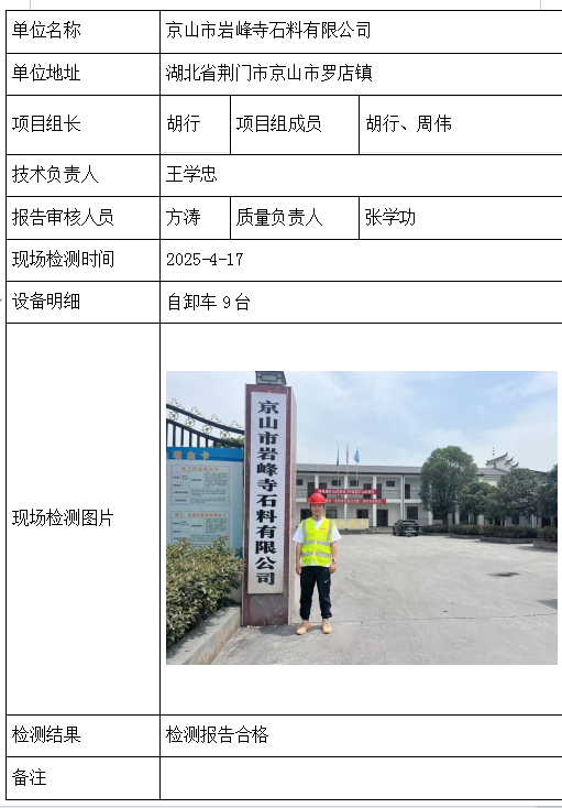 京山市岩峰寺石料有限公司2026/04/082025年检测检验项目 20 上一篇: 大冶市大志山矿业有限责任公司下一篇: 湖北京兰水泥集团有限公司 相关推荐 长阳县勒石包方解石矿 2026/04/10 7 查看全文 大冶市灵乡正旺铁矿二采区 2026/04/10 4 查看全文 大冶市陈贵安船矿业有限公司 2026/04/10 9 查看全文 保康楚烽化工有限责任公司(楚烽磷矿) 2026/04/10 6 查看全文 您好!请登录 点击取消回复 称呼: 邮箱: 点击这里取消回复。