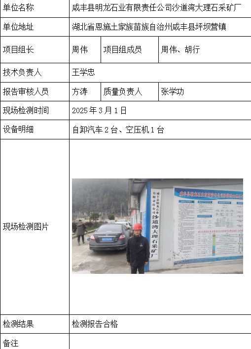 咸丰县明龙石业有限责任公司沙道湾大理石采矿厂2026/04/082025年检测检验项目 30 上一篇: 湖北杉树垭矿业有限公司下一篇: 天津矿山工程有限公司泰和分公司 相关推荐 长阳县勒石包方解石矿 2026/04/10 7 查看全文 大冶市灵乡正旺铁矿二采区 2026/04/10 4 查看全文 大冶市陈贵安船矿业有限公司 2026/04/10 9 查看全文 保康楚烽化工有限责任公司(楚烽磷矿) 2026/04/10 6 查看全文 您好!请登录 点击取消回复 称呼: 邮箱: 点击这里取消回复。