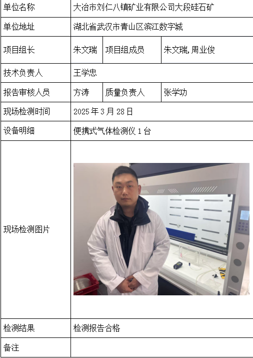 大冶市刘仁八镇矿业有限公司大段硅石矿2026/04/082025年检测检验项目 20 上一篇: 大冶市兴红矿业有限公司下一篇: 湖北通瑞达矿业有限公司 相关推荐 长阳县勒石包方解石矿 2026/04/10 7 查看全文 大冶市灵乡正旺铁矿二采区 2026/04/10 4 查看全文 大冶市陈贵安船矿业有限公司 2026/04/10 9 查看全文 保康楚烽化工有限责任公司(楚烽磷矿) 2026/04/10 6 查看全文 您好!请登录 点击取消回复 称呼: 邮箱: 点击这里取消回复。