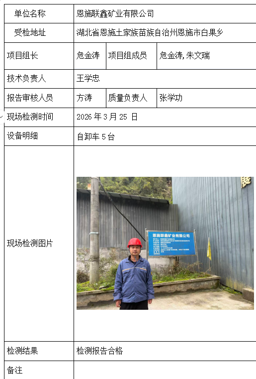 恩施联鑫矿业有限公司2026/04/082026年检测检验项目 30 上一篇: 建始县长梁桂花建材有限公司下一篇: 湖北鑫荣矿业有限公司 相关推荐 吉安市青原区茶家山采石场(普通合伙) 2026/04/09 6 查看全文 阳新县宏达矿业有限责任公司 2026/04/08 4 查看全文 湖北兴发化工集团股份有限公司兴-神磷矿瓦屋矿区IV矿段 2026/04/08 4 查看全文 湖北冯家山矿业有限责任公司 2026/04/08 5 查看全文 您好!请登录 点击取消回复 称呼: 邮箱: 点击这里取消回复。