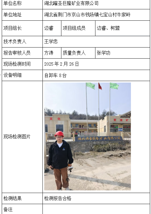 湖北曜圣巨隆矿业有限公司2026/04/082025年检测检验项目 20 上一篇: 京山鞍顺建材有限公司下一篇: 湖北恒顺矿业有限责任公司恒顺磷矿 相关推荐 长阳县勒石包方解石矿 2026/04/10 7 查看全文 大冶市灵乡正旺铁矿二采区 2026/04/10 4 查看全文 大冶市陈贵安船矿业有限公司 2026/04/10 9 查看全文 保康楚烽化工有限责任公司(楚烽磷矿) 2026/04/10 6 查看全文 您好!请登录 点击取消回复 称呼: 邮箱: 点击这里取消回复。