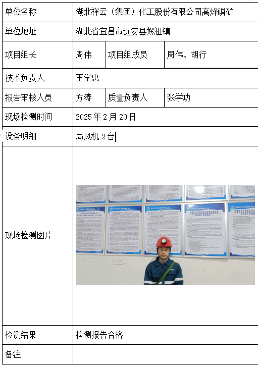 湖北祥云(集团)化工股份有限公司高烽磷矿2026/04/082025年检测检验项目 20 上一篇: 宜昌朗天新型建材有限公司下一篇: 荆旅膏都(湖北)矿业有限公司 相关推荐 长阳县勒石包方解石矿 2026/04/10 8 查看全文 大冶市灵乡正旺铁矿二采区 2026/04/10 5 查看全文 大冶市陈贵安船矿业有限公司 2026/04/10 10 查看全文 保康楚烽化工有限责任公司(楚烽磷矿) 2026/04/10 7 查看全文 您好!请登录 点击取消回复 称呼: 邮箱: 点击这里取消回复。