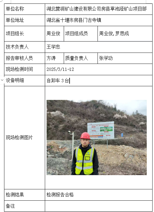 湖北营润矿山建设有限公司房县草池垭矿山项目部2026/04/082025年检测检验项目 20 上一篇: 新干县新衡矿业有限公司下一篇: 保康县保丰矿业有限公司石灰山磷矿袁家沟矿井 相关推荐 长阳县勒石包方解石矿 2026/04/10 7 查看全文 大冶市灵乡正旺铁矿二采区 2026/04/10 4 查看全文 大冶市陈贵安船矿业有限公司 2026/04/10 9 查看全文 保康楚烽化工有限责任公司(楚烽磷矿) 2026/04/10 6 查看全文 您好!请登录 点击取消回复 称呼: 邮箱: 点击这里取消回复。