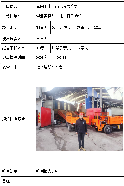 襄阳市丰荣磷化有限公司2026/04/082026年检测检验项目 20 上一篇: 湖北东达矿业有限公司下一篇: 大冶市大红山矿业有限公司勤缘采区大冶市大红山矿业有限公司勤缘采区 相关推荐 宜昌兴臣爆破工程有限公司南沟磷矿项目部 2026/04/17 0 查看全文 湖北三鑫金铜股份有限公司 2026/04/17 0 查看全文 湖北信佳建设工程有限公司驻大杉树磷矿项目部 2026/04/17 0 查看全文 湖北三宁矿业有限公司挑水河磷矿东部矿段909工区 2026/04/17 0 查看全文 您好!请登录 点击取消回复 称呼: 邮箱: 点击这里取消回复。