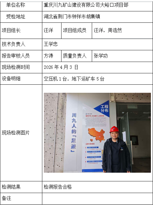 重庆川九矿山建设有限公司大峪口项目部2026/04/082026年检测检验项目 00 上一篇: 大冶市陈贵刘家畈矿业有限公司下一篇: 湖北冯家山矿业有限责任公司 相关推荐 吉安市青原区茶家山采石场(普通合伙) 2026/04/09 3 查看全文 阳新县宏达矿业有限责任公司 2026/04/08 1 查看全文 湖北兴发化工集团股份有限公司兴-神磷矿瓦屋矿区IV矿段 2026/04/08 1 查看全文 湖北冯家山矿业有限责任公司 2026/04/08 1 查看全文 您好!请登录 点击取消回复 称呼: 邮箱: 点击这里取消回复。