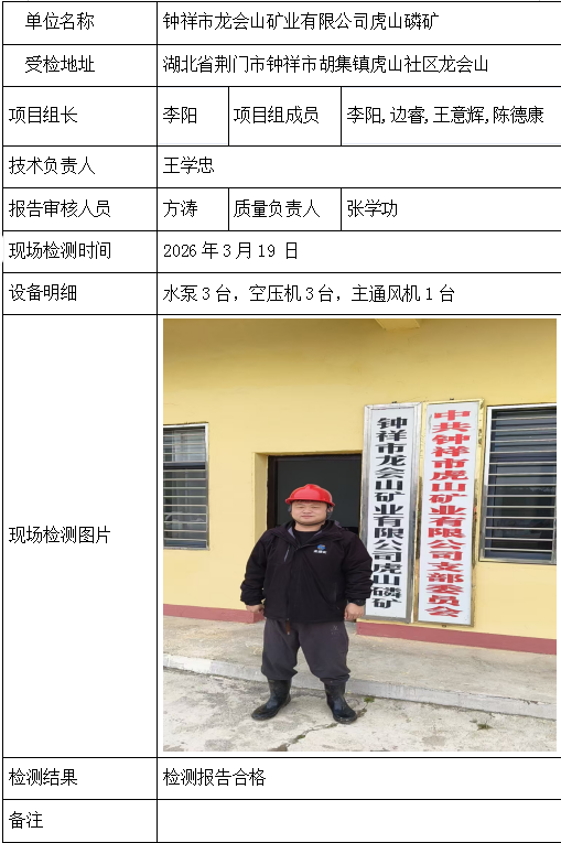 钟祥市龙会山矿业有限公司虎山磷矿2026/04/082026年检测检验项目 00 上一篇: 保康县中坪磷化工有限公司下一篇: 武穴市陆顺汽车运输有限公司 相关推荐 吉安市青原区茶家山采石场(普通合伙) 2026/04/09 3 查看全文 阳新县宏达矿业有限责任公司 2026/04/08 1 查看全文 湖北兴发化工集团股份有限公司兴-神磷矿瓦屋矿区IV矿段 2026/04/08 1 查看全文 湖北冯家山矿业有限责任公司 2026/04/08 1 查看全文 您好!请登录 点击取消回复 称呼: 邮箱: 点击这里取消回复。