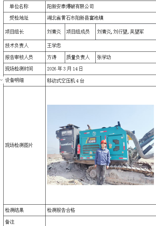 阳新安泰爆破有限公司2026/04/082026年检测检验项目 00 上一篇: 湖北金誉欣矿业有限公司下一篇: 武钢资源集团程潮矿业有限公司 相关推荐 吉安市青原区茶家山采石场(普通合伙) 2026/04/09 3 查看全文 阳新县宏达矿业有限责任公司 2026/04/08 1 查看全文 湖北兴发化工集团股份有限公司兴-神磷矿瓦屋矿区IV矿段 2026/04/08 1 查看全文 湖北冯家山矿业有限责任公司 2026/04/08 1 查看全文 您好!请登录 点击取消回复 称呼: 邮箱: 点击这里取消回复。