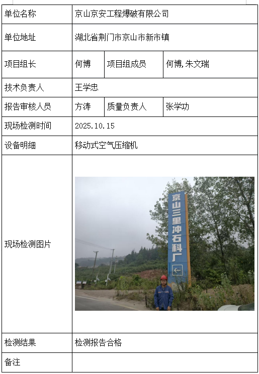 京山京安工程爆破有限公司2026/04/092025年检测检验项目 20 上一篇: 竹山县白岩石材石料有限责任公司下一篇: 湖北华灵矿业集团有限公司普庆铁矿 相关推荐 长阳县勒石包方解石矿 2026/04/10 7 查看全文 大冶市灵乡正旺铁矿二采区 2026/04/10 4 查看全文 大冶市陈贵安船矿业有限公司 2026/04/10 9 查看全文 保康楚烽化工有限责任公司(楚烽磷矿) 2026/04/10 6 查看全文 您好!请登录 点击取消回复 称呼: 邮箱: 点击这里取消回复。