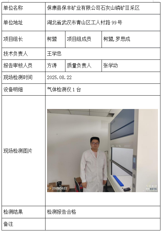 保康县保丰矿业有限公司石灰山磷矿Ⅲ采区2026/04/092025年检测检验项目 30 上一篇: 大冶市陈贵大广山矿业有限公司下一篇: 长阳大堰矿粉有限公司 相关推荐 长阳县勒石包方解石矿 2026/04/10 7 查看全文 大冶市灵乡正旺铁矿二采区 2026/04/10 4 查看全文 大冶市陈贵安船矿业有限公司 2026/04/10 9 查看全文 保康楚烽化工有限责任公司(楚烽磷矿) 2026/04/10 6 查看全文 您好!请登录 点击取消回复 称呼: 邮箱: 点击这里取消回复。