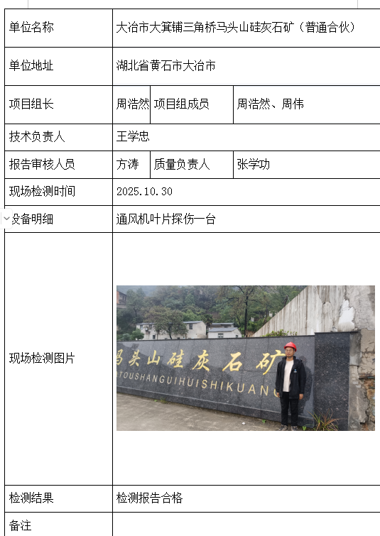 大冶市大箕铺三角桥马头山硅灰石矿(普通合伙)2026/04/092025年检测检验项目 20 上一篇: 阳新县金瓶山矿业有限公司下一篇: 宜昌市明鑫工贸有限公司 相关推荐 长阳县勒石包方解石矿 2026/04/10 7 查看全文 大冶市灵乡正旺铁矿二采区 2026/04/10 4 查看全文 大冶市陈贵安船矿业有限公司 2026/04/10 9 查看全文 保康楚烽化工有限责任公司(楚烽磷矿) 2026/04/10 6 查看全文 您好!请登录 点击取消回复 称呼: 邮箱: 点击这里取消回复。