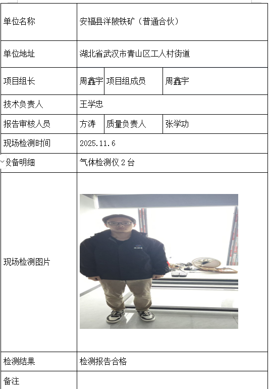 安福县洋陂铁矿(普通合伙)2026/04/092025年检测检验项目 20 上一篇: 保康尧治河宏磷化工有限公司下一篇: 湖北神农磷业科技股份有限公司寨湾磷矿 相关推荐 长阳县勒石包方解石矿 2026/04/10 7 查看全文 大冶市灵乡正旺铁矿二采区 2026/04/10 4 查看全文 大冶市陈贵安船矿业有限公司 2026/04/10 9 查看全文 保康楚烽化工有限责任公司(楚烽磷矿) 2026/04/10 6 查看全文 您好!请登录 点击取消回复 称呼: 邮箱: 点击这里取消回复。