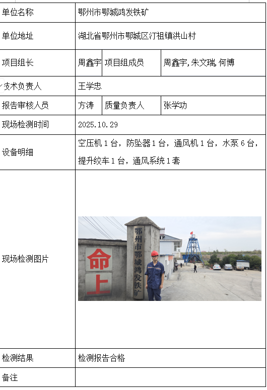 鄂州市鄂城鸿发铁矿2026/04/092025年检测检验项目 20 上一篇: 大冶市天华矿业有限公司下一篇: 阳新县金瓶山矿业有限公司 相关推荐 长阳县勒石包方解石矿 2026/04/10 7 查看全文 大冶市灵乡正旺铁矿二采区 2026/04/10 4 查看全文 大冶市陈贵安船矿业有限公司 2026/04/10 9 查看全文 保康楚烽化工有限责任公司(楚烽磷矿) 2026/04/10 6 查看全文 您好!请登录 点击取消回复 称呼: 邮箱: 点击这里取消回复。
