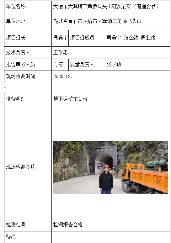 大冶市大箕铺三角桥马头山硅灰石矿(普通合伙)2026/04/102025年检测检验项目 30 上一篇: 湖北光谷东国有资本投资运营集团有限公司下一篇: 大冶市大箕铺镇石家堍马石头硅灰石矿(普通合伙) 相关推荐 长阳县勒石包方解石矿 2026/04/10 7 查看全文 大冶市灵乡正旺铁矿二采区 2026/04/10 4 查看全文 大冶市陈贵安船矿业有限公司 2026/04/10 9 查看全文 保康楚烽化工有限责任公司(楚烽磷矿) 2026/04/10 6 查看全文 您好!请登录 点击取消回复 称呼: 邮箱: 点击这里取消回复。