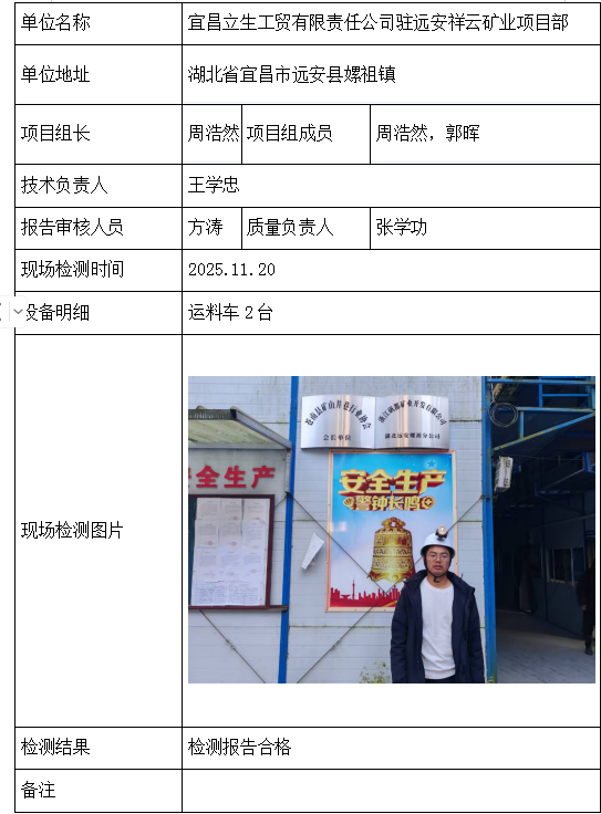 宜昌立生工贸有限责任公司驻远安祥云矿业项目部2026/04/102025年检测检验项目 20 上一篇: 浙江矾都矿业开发有限公司驻远安祥云矿业项目部下一篇: 钟祥市秦冲磷矿 相关推荐 长阳县勒石包方解石矿 2026/04/10 7 查看全文 大冶市灵乡正旺铁矿二采区 2026/04/10 4 查看全文 大冶市陈贵安船矿业有限公司 2026/04/10 9 查看全文 保康楚烽化工有限责任公司(楚烽磷矿) 2026/04/10 6 查看全文 您好!请登录 点击取消回复 称呼: 邮箱: 点击这里取消回复。