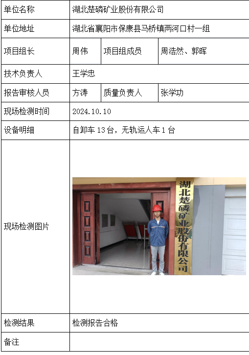 湖北楚磷矿业股份有限公司2026/04/102024年检测检验项目 10 上一篇: 湖南楚湘建设工程集团有限公司远安分公司下一篇: 阳新县鑫成矿业有限公司 相关推荐 黄梅龙源石膏有限公司 2026/04/13 2 查看全文 湖北威泰绿建科技有限公司 2026/04/13 3 查看全文 保康县鑫润矿业有限责任公司康家沟磷矿一采区 2026/04/13 3 查看全文 湖北杉树垭矿业有限公司 2026/04/13 2 查看全文 您好!请登录 点击取消回复 称呼: 邮箱: 点击这里取消回复。