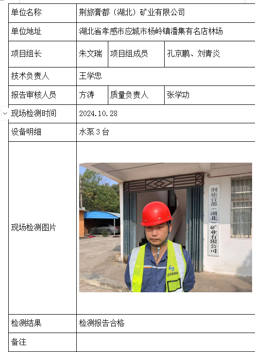 荆旅膏都(湖北)矿业有限公司2026/04/102024年检测检验项目 00 上一篇: 鄂州市胜灵矿业有限责任公司下一篇: 鄂州市鄂城鸿发铁矿 相关推荐 黄梅龙源石膏有限公司 2026/04/13 2 查看全文 湖北威泰绿建科技有限公司 2026/04/13 3 查看全文 保康县鑫润矿业有限责任公司康家沟磷矿一采区 2026/04/13 3 查看全文 湖北杉树垭矿业有限公司 2026/04/13 2 查看全文 您好!请登录 点击取消回复 称呼: 邮箱: 点击这里取消回复。