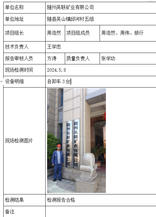 随州吴联矿业有限公司2026/04/102024年检测检验项目 20 上一篇: 襄阳红山矿业有限公司下一篇: 随州吴随矿业有限公司 相关推荐 黄梅龙源石膏有限公司 2026/04/13 5 查看全文 湖北威泰绿建科技有限公司 2026/04/13 6 查看全文 保康县鑫润矿业有限责任公司康家沟磷矿一采区 2026/04/13 5 查看全文 湖北杉树垭矿业有限公司 2026/04/13 4 查看全文 您好!请登录 点击取消回复 称呼: 邮箱: 点击这里取消回复。