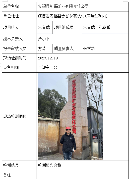 安福县新福矿业有限责任公司2026/04/132023年检测检验项目 00 上一篇: 安福县草根矿业股份有限公司赣闽铁矿下一篇: 孝感东森物流有限公司 相关推荐 黄梅龙源石膏有限公司 2026/04/13 1 查看全文 安徽中掘建设工程有限公司武穴分公司 2026/04/13 1 查看全文 华新骨料(阳新)有限公司 2026/04/13 1 查看全文 钟祥市秦冲磷矿刘冲采区 2026/04/13 1 查看全文 您好!请登录 点击取消回复 称呼: 邮箱: 点击这里取消回复。