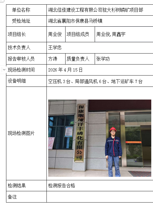 湖北信佳建设工程有限公司驻大杉树磷矿项目部2026/04/172026年检测检验项目 10 上一篇: 湖北华灵矿业集团有限公司普庆铁矿下一篇: 京山国源矿业有限公司 相关推荐 宜昌兴臣爆破工程有限公司南沟磷矿项目部 2026/04/17 1 查看全文 湖北三鑫金铜股份有限公司 2026/04/17 0 查看全文 湖北信佳建设工程有限公司驻大杉树磷矿项目部 2026/04/17 0 查看全文 湖北三宁矿业有限公司挑水河磷矿东部矿段909工区 2026/04/17 1 查看全文 您好!请登录 点击取消回复 称呼: 邮箱: 点击这里取消回复。