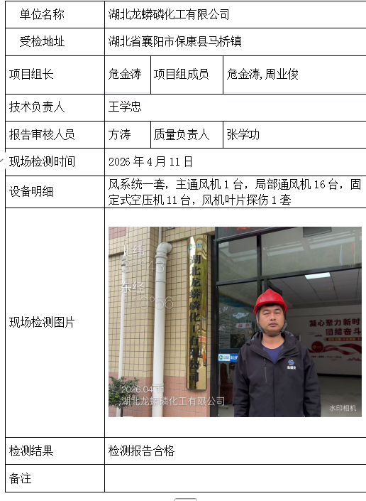 湖北龙蟒磷化工有限公司2026/04/172026年检测检验项目 10 上一篇: 恩施港来芳圆石材有限责任公司下一篇: 来凤县长家湾方解石矿业有限公司 相关推荐 宜昌兴臣爆破工程有限公司南沟磷矿项目部 2026/04/17 1 查看全文 湖北三鑫金铜股份有限公司 2026/04/17 0 查看全文 湖北信佳建设工程有限公司驻大杉树磷矿项目部 2026/04/17 0 查看全文 湖北三宁矿业有限公司挑水河磷矿东部矿段909工区 2026/04/17 1 查看全文 您好!请登录 点击取消回复 称呼: 邮箱: 点击这里取消回复。