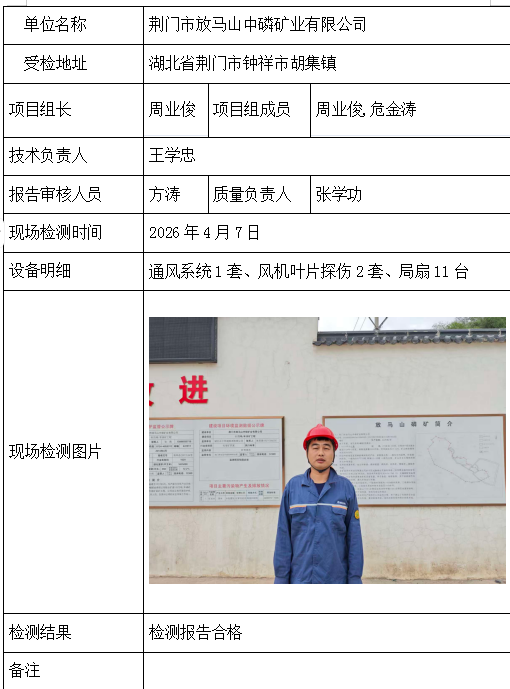荆门市放马山中磷矿业有限公司2026/04/172026年检测检验项目 00 上一篇: 湖北营润矿山建设有限公司下一篇: 宜昌汇鑫磷化工贸有限责任公司 相关推荐 宜昌兴臣爆破工程有限公司南沟磷矿项目部 2026/04/17 1 查看全文 湖北三鑫金铜股份有限公司 2026/04/17 0 查看全文 湖北信佳建设工程有限公司驻大杉树磷矿项目部 2026/04/17 0 查看全文 湖北三宁矿业有限公司挑水河磷矿东部矿段909工区 2026/04/17 1 查看全文 您好!请登录 点击取消回复 称呼: 邮箱: 点击这里取消回复。