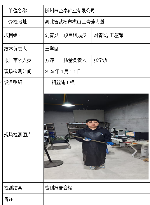 随州市金泰矿业有限公司2026/04/172026年检测检验项目 00 上一篇: 保康县良云矿业有限公司黄龙观采区下一篇: 峡江县金江铁矿 相关推荐 宜昌兴臣爆破工程有限公司南沟磷矿项目部 2026/04/17 1 查看全文 湖北三鑫金铜股份有限公司 2026/04/17 0 查看全文 湖北信佳建设工程有限公司驻大杉树磷矿项目部 2026/04/17 0 查看全文 湖北三宁矿业有限公司挑水河磷矿东部矿段909工区 2026/04/17 1 查看全文 您好!请登录 点击取消回复 称呼: 邮箱: 点击这里取消回复。