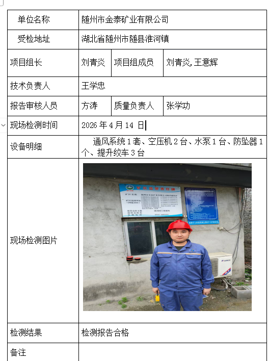随州市金泰矿业有限公司2026/04/172026年检测检验项目 00 上一篇: 湖北三宁矿业有限公司下一篇: 钟祥市秦冲磷矿 相关推荐 宜昌兴臣爆破工程有限公司南沟磷矿项目部 2026/04/17 1 查看全文 湖北三鑫金铜股份有限公司 2026/04/17 0 查看全文 湖北信佳建设工程有限公司驻大杉树磷矿项目部 2026/04/17 0 查看全文 湖北三宁矿业有限公司挑水河磷矿东部矿段909工区 2026/04/17 1 查看全文 您好!请登录 点击取消回复 称呼: 邮箱: 点击这里取消回复。